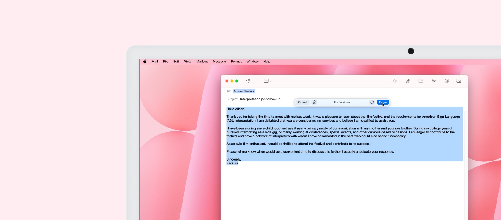 Outils d’écriture. Apple Intelligence est capable de réviser vos écrits, d’en proposer différentes versions jusqu’à l’obtention du ton et du style désirés, et de résumer un texte sélectionné – d’un simple clic.