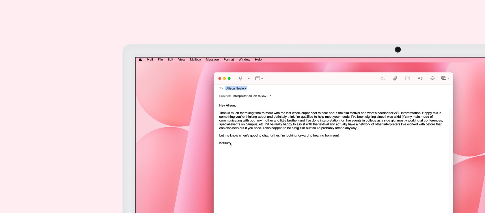 Apple Intelligence est conçue pour protéger votre vie privée à chaque étape. Intégrée au cœur de votre Mac, elle utilise le traitement embarqué pour tenir compte de vos informations personnelles sans jamais les collecter.