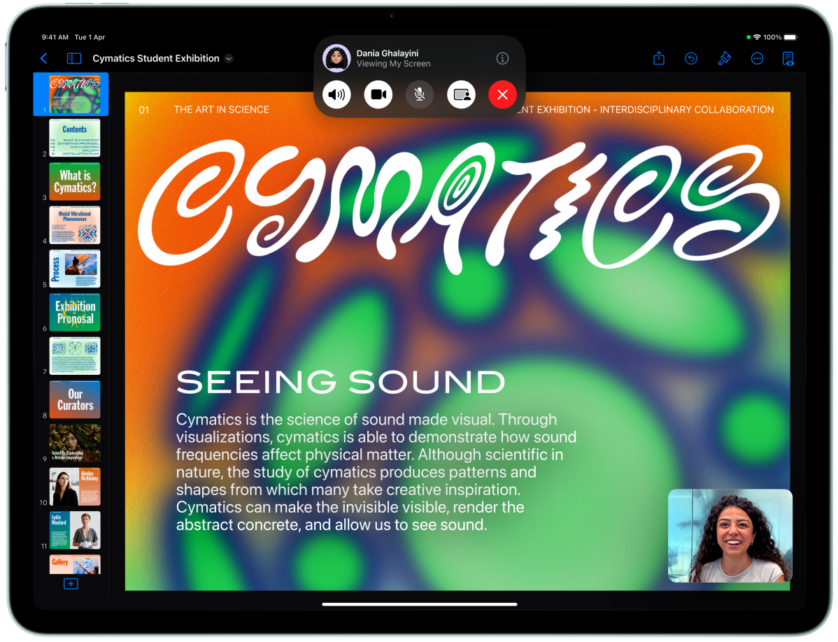iPad Air, front exterior, user is on FaceTime and looking at Keynote in front of another iPad Air, back exterior