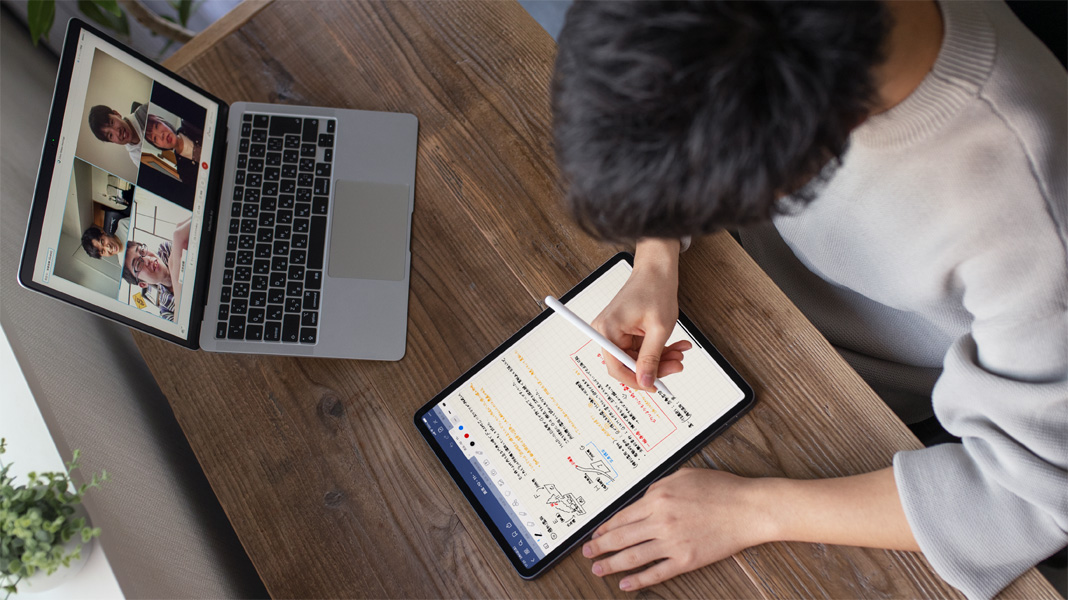 正如很多學生一樣,難波拓斗利用尖端科技的優勢,轉為遙距學習。在網上上課期間,他透過 iPad 的分割螢幕功能,一邊看著教授的簡報,一邊寫下筆記。在虛擬學習小組中,難波拓斗使用 Mac 的 FaceTime 與同學聯繫,同時運用 iPad 的數碼畫板,全情投入記下分組習作。