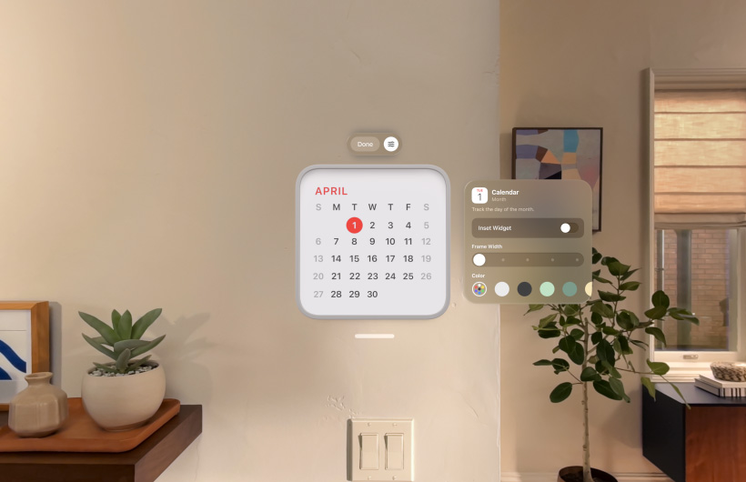 With widgets, you can arrange your favorite information and apps — like Photos, Clock, Music, and Calendar — in your space exactly how you want. Customize their frame thickness, color, and depth, and find them just where you left them, every time you put on Apple Vision Pro.