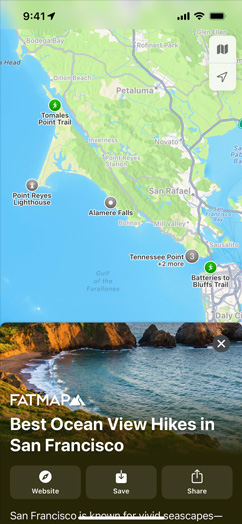 Choose a destination, and its interactive place card shows you everything you need at a glance. See basics like address, hours, website, and phone number, along with details like price range, photo galleries, associated Guides, accepted payment types — even whether you can bring your dog. Launch Flyover or Look Around to get a sense of the location and surroundings. You can even quickly and securely rent a bike, pay for parking, order food, and more with just a tap. And for places that use Business Chat, you can reach out and ask questions directly in Messages.