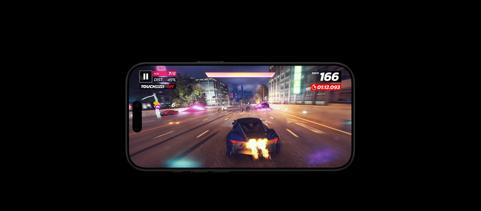 Internal design improvements — including a 100 per cent recycled aluminium thermal substructure and back glass optimisations that further dissipate heat — enable up to 20 per cent better sustained perform­ance than iPhone 15 Pro. So you can do all the things you love — like high-intensity gaming — for longer.