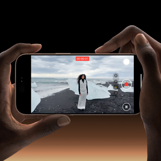 iPhone 16 Pro also provides a big leap in audio perform­ance with four studio-quality mics for higher-quality recording. They provide a lower noise floor so you get more true-to-life sounds. New Spatial Audio capture makes your videos sound more immersive when listening with AirPods. And thanks to wind noise reduction, the audio quality is even clearer.