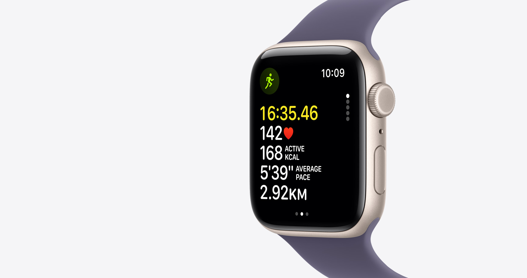 Apple Watch SE 3, aluminum case, starlight color, SOS Fall Detection notification, emergency call and I'm OK buttons, right side exterior, Digital Crown, microphone, side button, band, Sport Loop, purple fog color