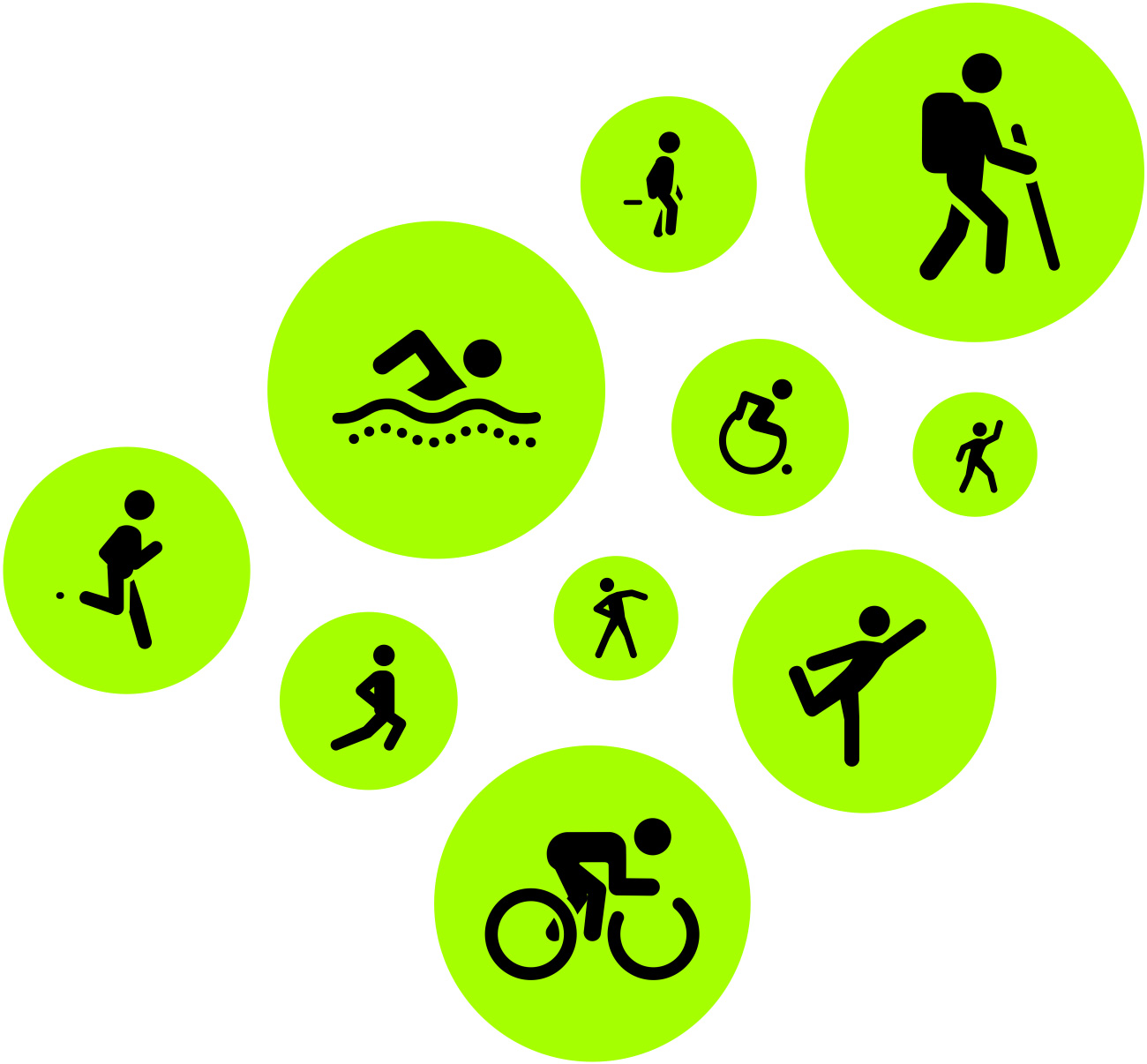 Workout icons: run, walk, swim, hike, cycle, dance, stretch, yoga