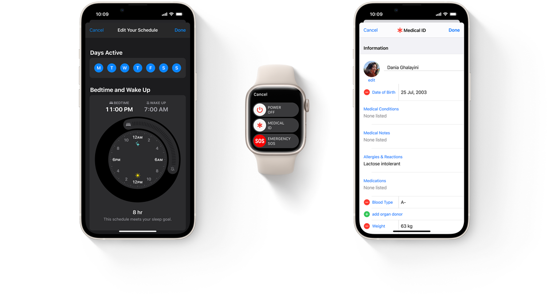 On iPhone and Apple Watch, emergency personnel can quickly access a Medical ID with important information like allergies, blood type, emergency contacts, and more.